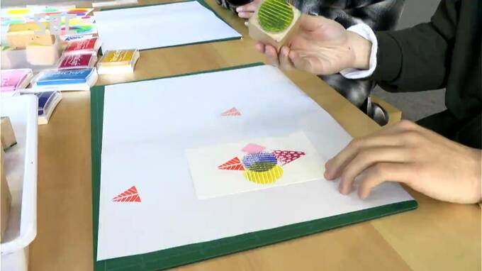 会場ではスタンプを使ってはがきに色とりどりの模様をつけるワークショップも行われ、訪れた人たちが作業を楽しんでいました。