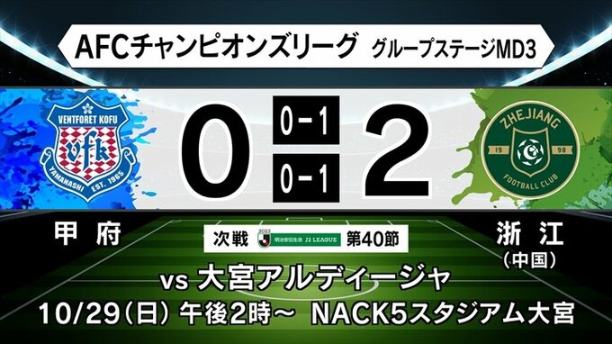 ACLグループステージ第3戦、ヴァンフォーレ甲府はきのう25日にアウェーで中国の浙江FCと対戦し、2対0で敗れACL初黒星を喫しました。