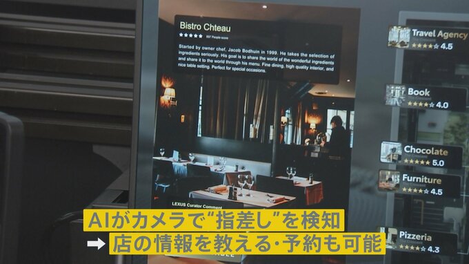 AI=人工知能により、運転席のカメラでドライバーが指さす方向を検知。店の情報まで教えてくれ、予約も可能です。