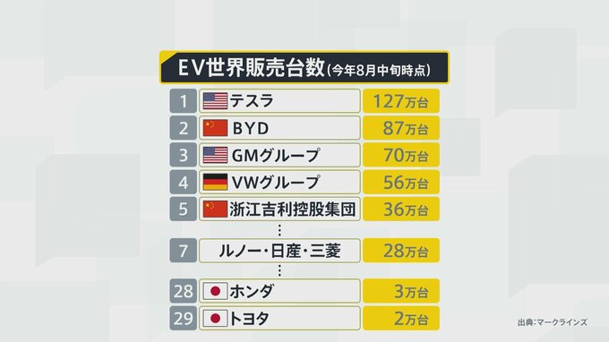 調査会社のマークラインズによると、2022年のEVの世界販売台数はアメリカ・テスラや中国・BYDが大きくリードしています。