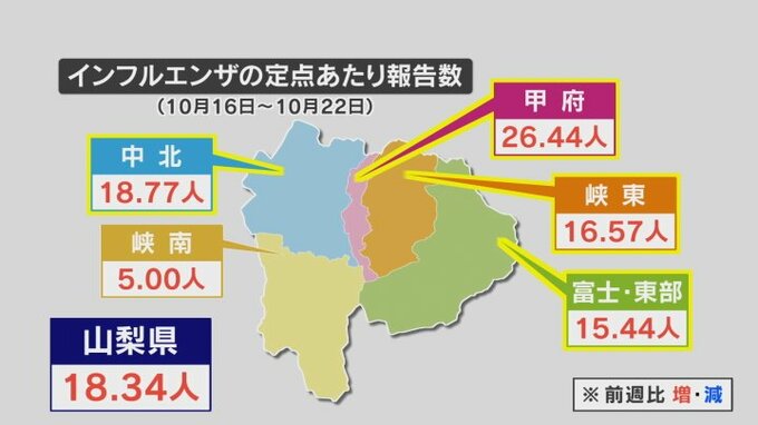 地域別の感染報告数は、すでに「注意報レベル」となっている甲府市と中北、富士・東部に加え、新たに峡東が注意報レベル入りしました。