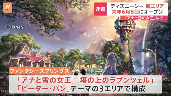 新エリアの開業日が決まりました。東京ディズニーシーの新エリア「ファンタジースプリングス」が、来年6月6日にオープンすることが決まりました。ディズニー映画の「アナと雪の女王」、「塔の上のラプンツェル」、…