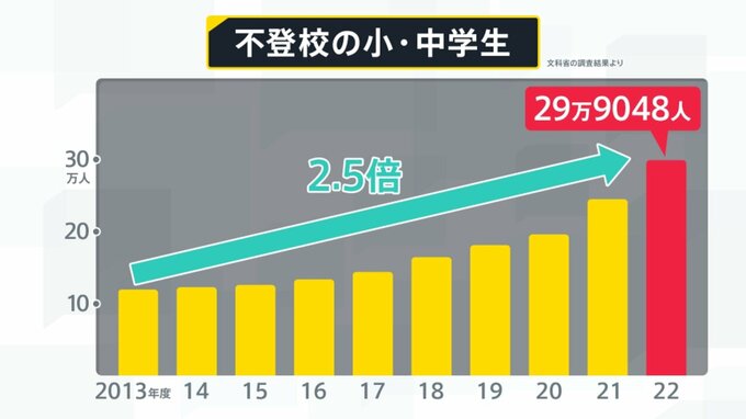 まずは不登校の現状を確認しておきます。不登校の小・中学生が増えています。2022年度は29万9048人で、10年前と比べると2.5倍と過去最多を更新しています。そんな中、今回の小椋市長の発言がありました。