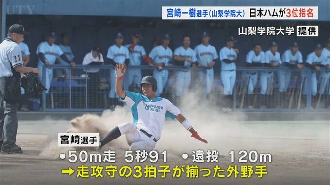山梨学院大学4年の宮崎一樹選手は50m5秒台の俊足に加え、遠投120mの強肩を誇る走攻守の3拍子が揃った外野手です。