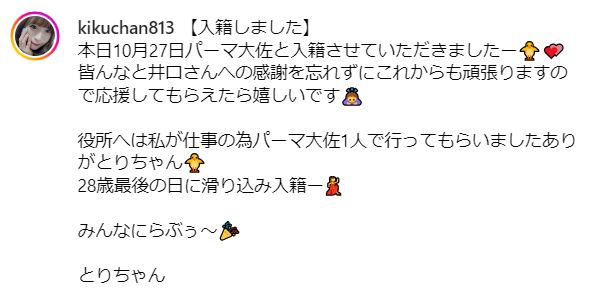アイドル鳥越さんは自身のインスタグラムを更新し「本日10月27日パーマ大佐と入籍させていただきましたー」と報告。「皆んなと井口さんへの感謝を忘れずにこれからも頑張りますので応援してもらえたら嬉しいです」と抱負を述べています。