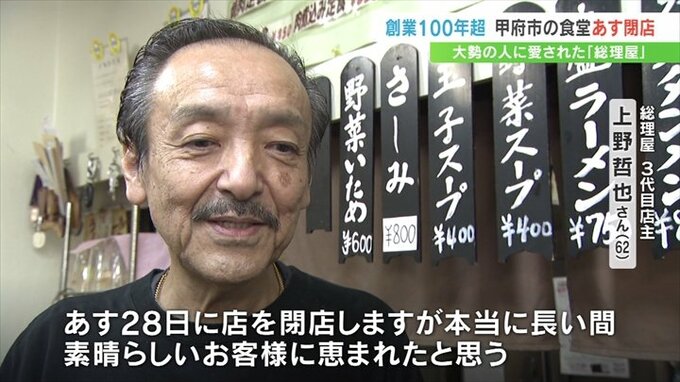あす28日に店を閉店しますけど、本当に長い間素晴らしいお客様に恵まれたと思っています。総理屋の前を通った時は「変わった名前の食堂があったな」と思い出してもらいたいなと思います。