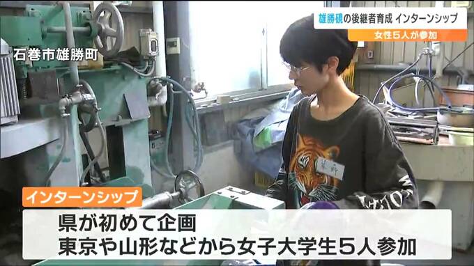このインターンシップは、宮城県が初めて企画したもので、東京や山形などから女子大学生5人が参加し、石皿を作る作業などを体験しました。雄勝硯は、石巻市雄勝町の山から切り出した石から作られる上質の硯です。被災による廃業などで、職人の数は震災前の半分の7人にまで減り、担い手の確保が課題となっています。