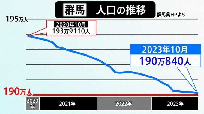 日本全体でも問題となっている人口の減少は群馬県にも押し寄せています。2020年10月に193万人いた人口も2023年10月には190万840人となり、3年で約4万人減少しています。群馬県の人口が190万人を下回る日もそう遠くはないのです。