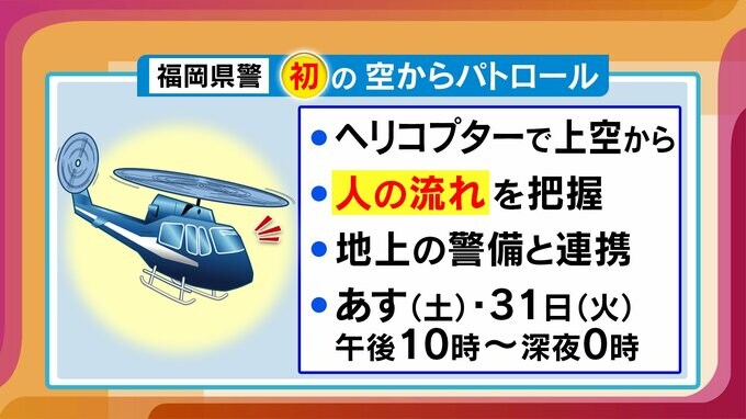 特に若者が集まることが予想される警固公園は警察官の見回りも始まっており、ヘリコプターによる上空監視も行われます。