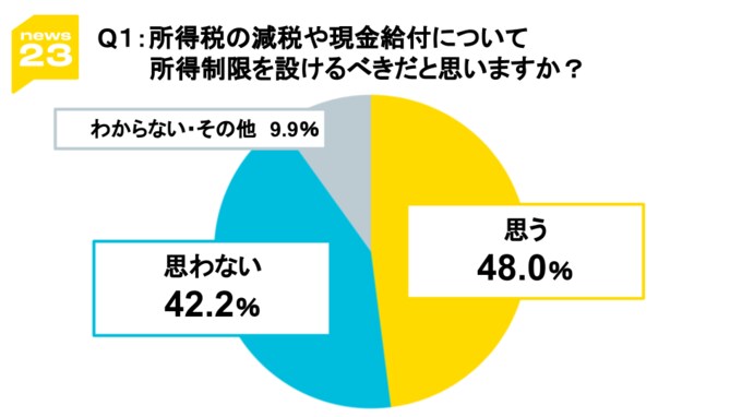▽所得税減税や現金給付について所得制限が必要か聞いたところ、「思う」が48.0%となり、「思わない」は42.2%となりました。
