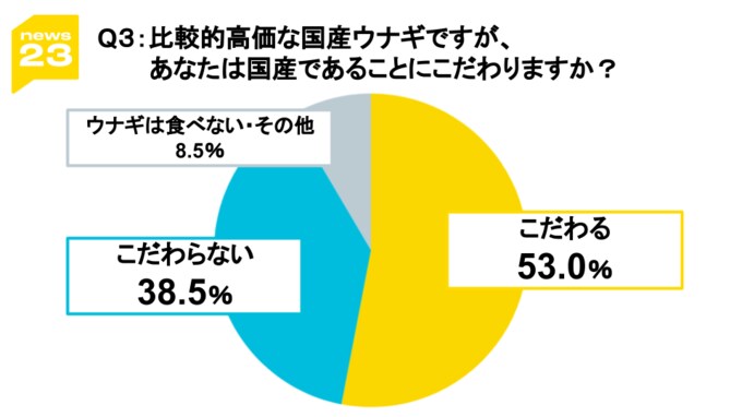 ▽ウナギは国産であることにこだわるかということについて、「こだわる」が約半数、「こだわらない」は4割弱となりました。