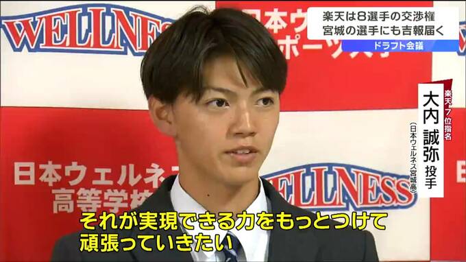 加えて今年は宮城の高校生にも吉報が届きました。楽天7巡目に指名されたのは東松島市出身の大内誠弥投手。身長191センチの大型右腕です。