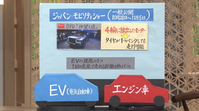 今回の「ジャパン・モビリティショー」では、様々なEV(電気自動車)が展示されました。中国BYDは、4つの車輪それぞれに独立したモーターを付けた車を発表。タイヤが1つパンクしても走り続けることができるといいます。