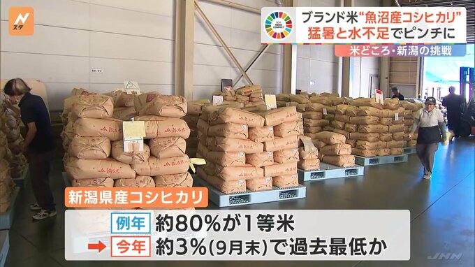 コメは粒の形や色、水分量などにより1等米から3等米に分けられます。新潟県産のコシヒカリは例年、80パーセントほどが1等米ですが、今年は9月末時点で3%ほどと、統計開始以来、最低となりそうです。