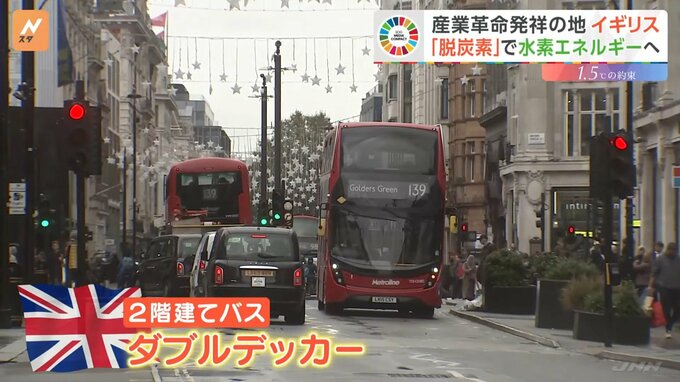 「ロンドン中心部を走るあちらの2階建てバス。実は水素で走っているんです」