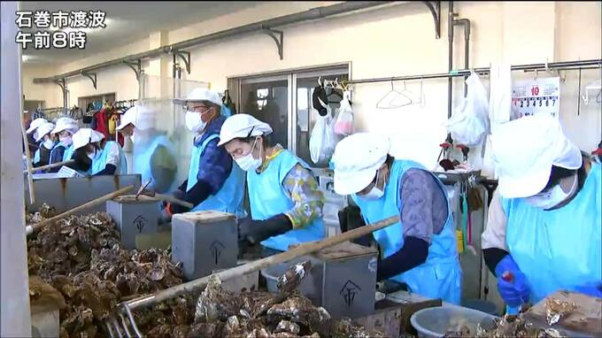 このうち、石巻市渡波の処理場では、生産者およそ120人が、29日水揚げをした養殖カキの殻を手際よくむいていました。