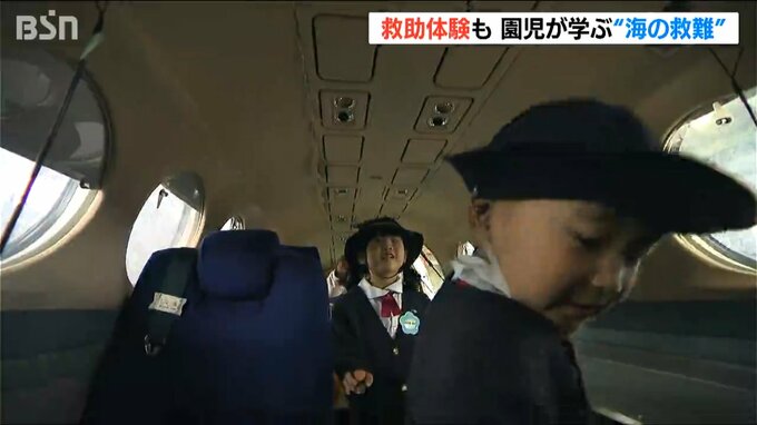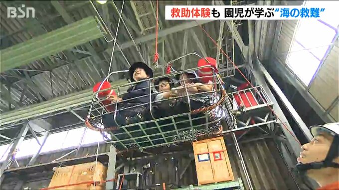 そして、海難事故などの際にヘリコプターで出動して吊上げ救助を行う『機動救難士』の救助体験も行い、急病人を引き上げるためのロープを、園児たちは力を合わせて引っ張りました。
