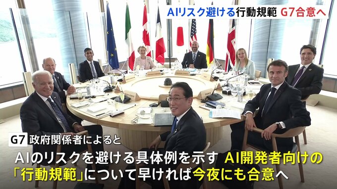 政府は、生成AIの開発者向けの行動規範について、G7=主要7か国の間で合意を取りまとめ、早ければきょうにも公表する予定です。政府関係者によりますと、G7は、AIの開発者に向けて、AIによるリスクを避けるための…