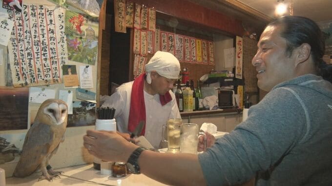 フクロウを肩に乗せ毎日飲み歩いているので、この辺りではフクロウおじさんとして知られる有名人です。