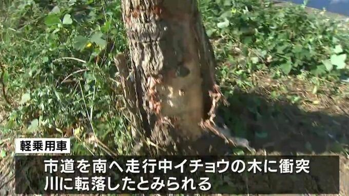 警察によりますと、軽乗用車は市道を南へ向かって走っていたところ、道路脇のイチョウの木に衝突し、そのまま川に転落したとみられています。