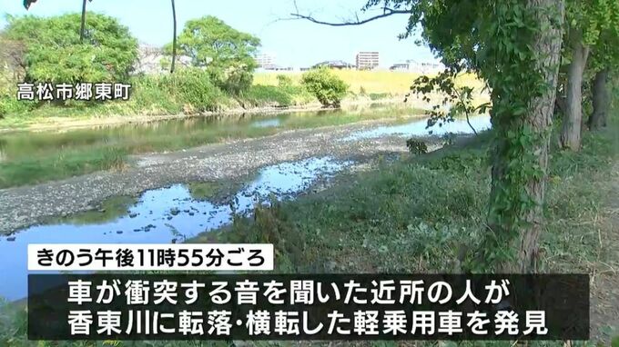 きのう午後11時55分ごろ、高松市郷東町の市道で、車が衝突する音を聞いた近所の人が現場に駆け付けたところ、道路のそばを流れる香東川に落ちて横転した軽乗用車を発見し、警察に通報しました。
