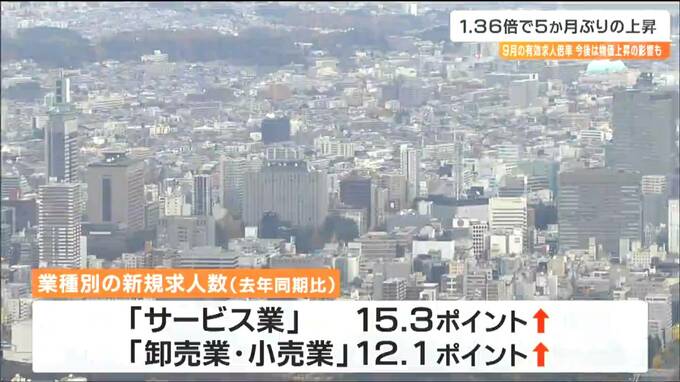 宮城県内の9月の有効求人倍率は1.36倍で、前の月を0.03ポイント上回り、5か月ぶりの上昇となりました。宮城労働局は、「求人数の持ち直しの動きに足踏みが見られるため、今後の物価上昇などの影響に注意が必要」としています。