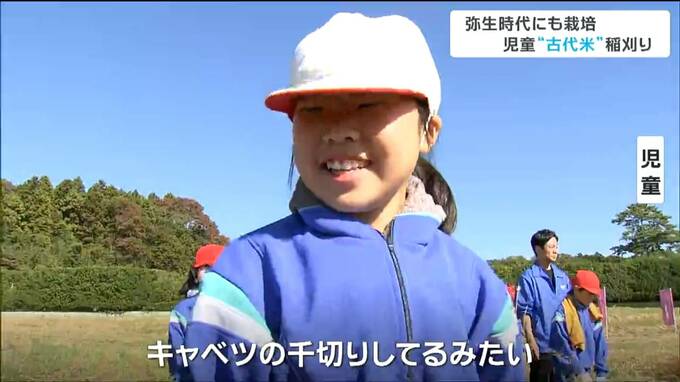 弥生時代からコメを栽培していたと伝わる宮城県多賀城市の田んぼで、市内の小学生が古代米の稲刈りを体験しました。