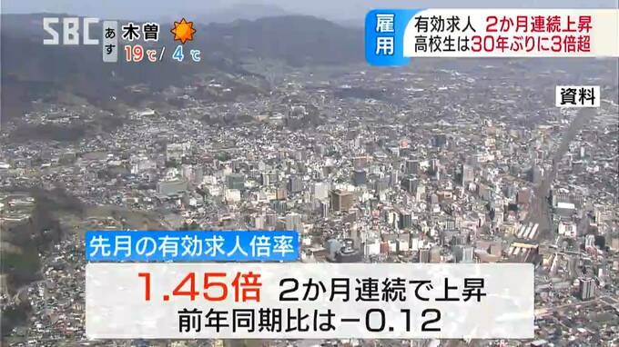 長野労働局によりますと、県内の9月の有効求人倍率は1.45倍で、2か月連続でわずかに上昇しましたが、前の年の9月よりは0.12ポイント低くなっています。