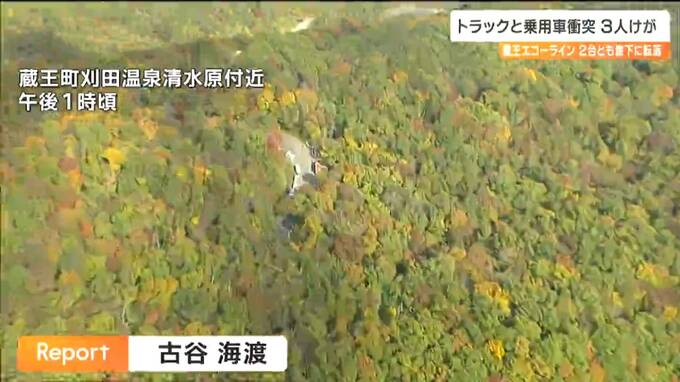31日午前、宮城県蔵王町の蔵王エコーラインで、トラックと乗用車が衝突しました。この事故で、2台とも崖の下に転落し男女3人がけがをしました。