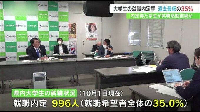 山梨労働局によりますと、2024年春に県内の大学を卒業する学生で、既に就職が内定したのは10月1日時点で996人で、就職希望者に占める割合は35%となりました。