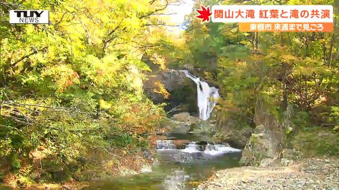 山形県東根市の関山大滝では今、紅葉が見ごろを迎えています。赤や黄色、緑・・・色とりどりの葉っぱと、滝が奏でる音。東根市の関山大滝です。夏場は、水遊びのスポットとして、大勢の人を集める関山大滝。秋は、紅…