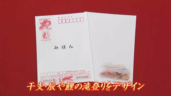 来年の年賀はがきには干支・辰や縁起物の鯉の滝登りがデザインされていて、