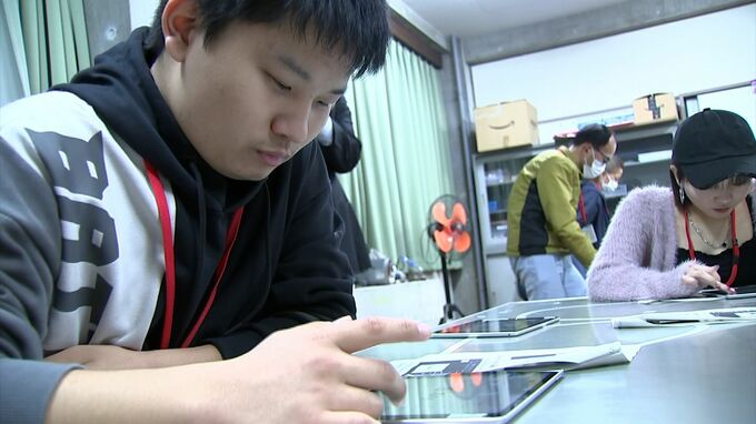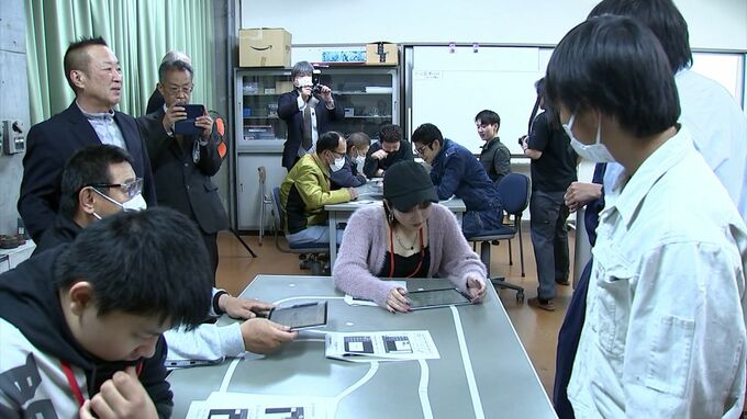 生徒らは定時制の機械科を見学し、タブレットで自分の名前をデザインしてレーザーで彫刻するキーホルダー製作を体験しました。
