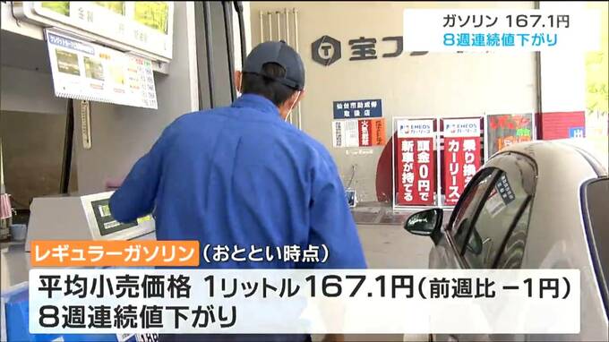 今週の宮城県内のレギュラーガソリンの価格は、1リットル167円10銭で8週連続の値下がりとなりました。