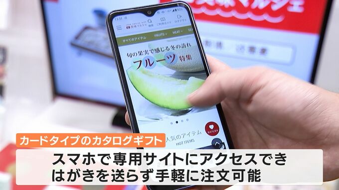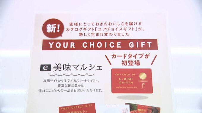 ハムやビールの詰め合わせなど定番の商品が並ぶなか、今年はカードタイプのカタログギフトが登場しました。