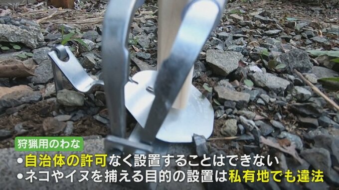 狩猟用のワナは自治体の許可なく設置することはできず、ネコや犬をとらえる目的で設置すると住宅の敷地内など私有地であっても違法となります。