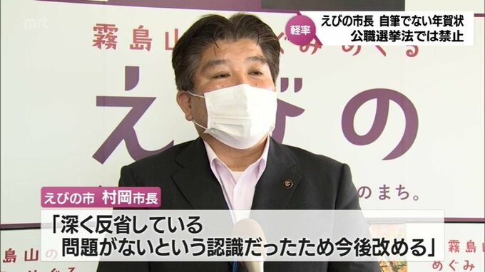 宮崎県えびの市の村岡隆明市長が、自筆ではない年賀状を市民に送っていたことがわかりました。えびの市によりますと、村岡市長は今年1月、年賀状の答礼として、宛先や新年のあいさつが印刷された自筆ではない年賀…