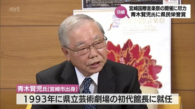 ことし8月に亡くなった宮崎県立芸術劇場の初代館長、青木賢児氏に「県民栄誉賞」が贈られることになりました。青木氏は、宮崎国際音楽祭の開催に尽力するなど文化の振興に貢献しました。宮崎市出身の青木賢児氏は、…
