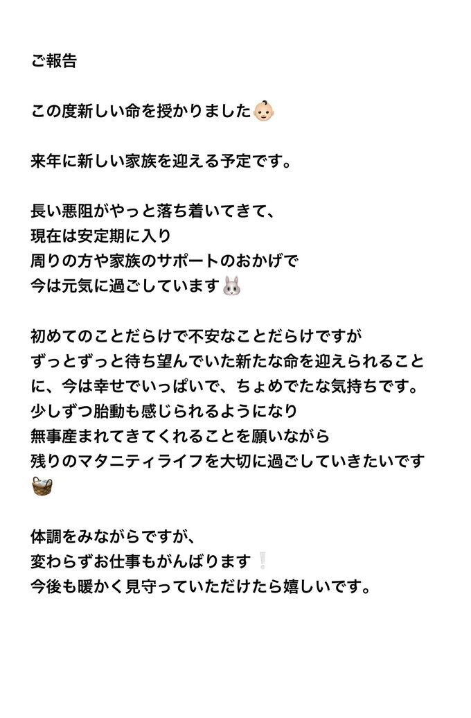 「初めてのことだらけで不安なことだらけですが ずっとずっと待ち望んでいた新たな命を迎えられることに、今は幸せでいっぱいで、 ちょめでたな気持ちです。少しずつ胎動も感じられるようになり無事産まれてきてくれることを願いながら残りのマタニティライフを大切に過ごしていきたいです」と幸せな胸の内を記しています。