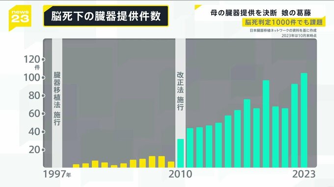 脳死判定後の臓器提供の件数も、2010年の法改正で、本人の意思が分からない場合でも、家族の承諾で提供ができるようになり、大幅に伸びました。