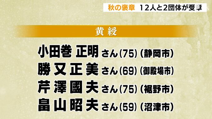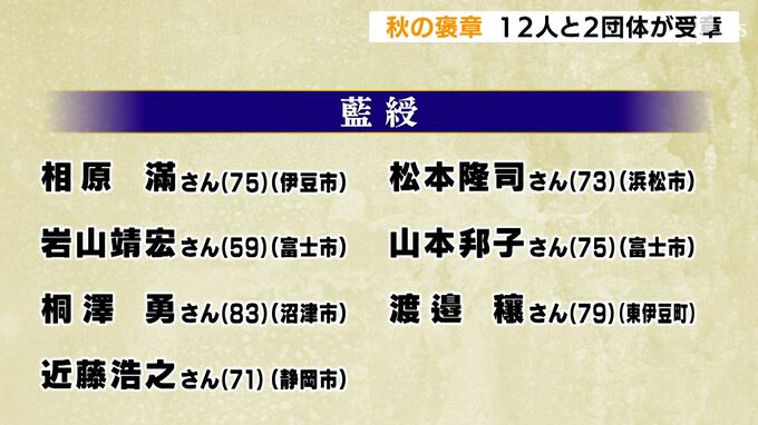 秋の褒章の受章者が11月2日発表され、静岡県内では12人と2つの団体が受章の栄誉に輝きました。