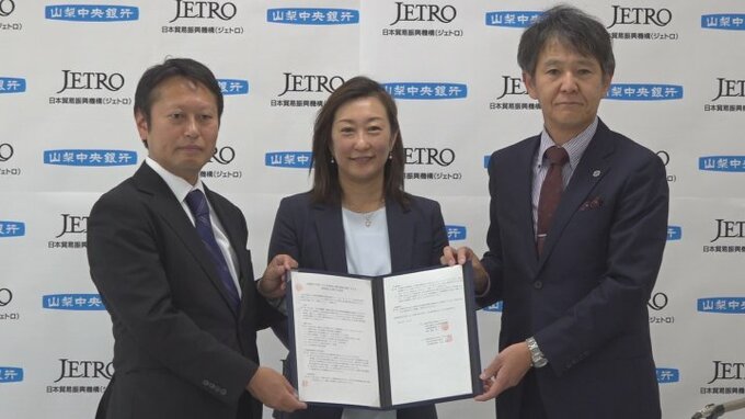 山梨県内企業の海外展開を支援しようと山梨中央銀行とJETRO=日本貿易振興機構が連携を強化していくことになりました。きょう2日は山梨中央銀行とジェトロの代表者が参加して連携強化に関する覚書を交わしました。…