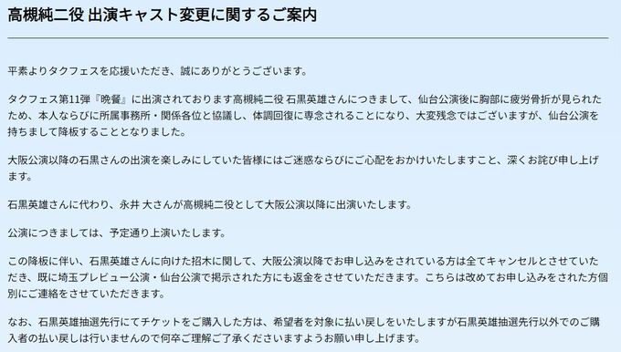公式サイトでは「高槻純二役 出演キャスト変更に関するご案内」と題して「タクフェス第11弾『晩餐』に出演されております高槻純二役 石黒英雄さんにつきまして、仙台公演後に胸部に疲労骨折が見られたため、本人ならびに所属事務所・関係各位と協議し、体調回復に専念されることになり、大変残念ではございますが、仙台公演を持ちまして降板することとなりました。」と発表しました。