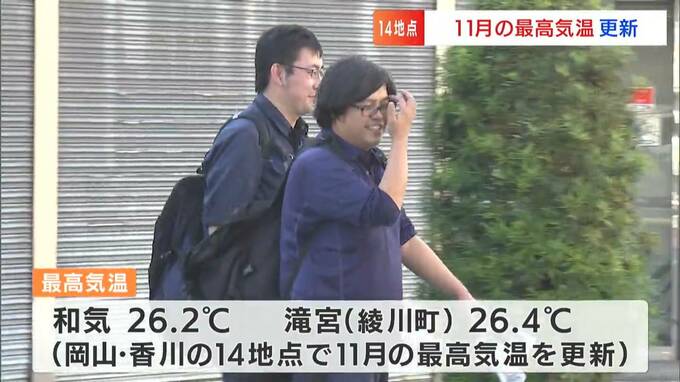 2日の最高気温は和気で26.2度、滝宮(綾川町)で26.4度など、岡山・香川の14地点で11月の最高気温を更新。また岡山は26.2度で、11月に夏日になるのは44年ぶりだということです。