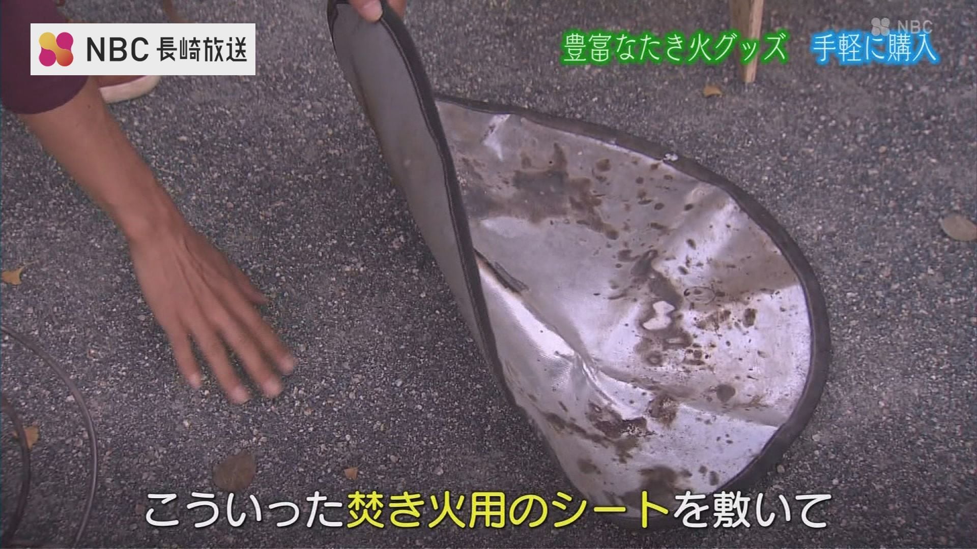 「芝の上で焚き火をするときとかは、こういった『焚き火用のシート』を敷いてあげてですね、芝生とか焼けてしまうのを防ぐ必要があります」