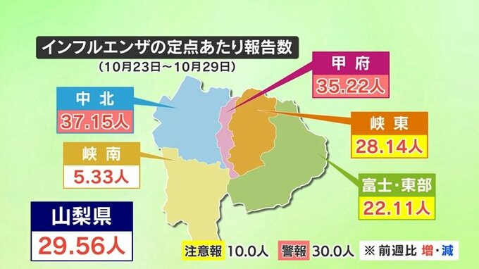 地域別の感染報告数は甲府市と中北地域が警報レベルの基準となる30人を超え、県と甲府市は11月2日、この2つの地域の流行が「警報レベル」に入ったと発表しました。