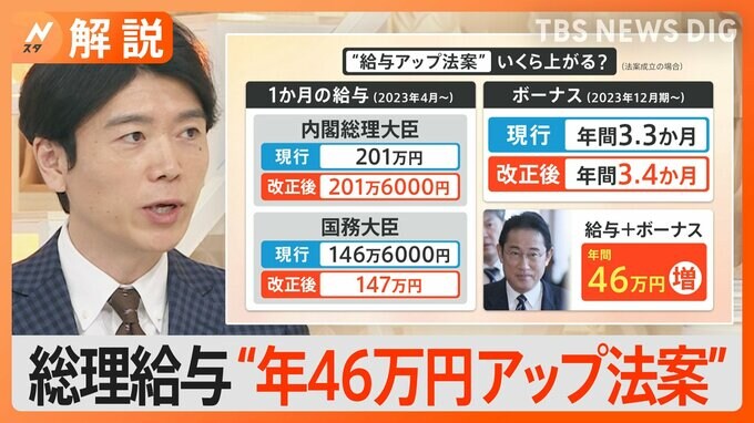 17兆円前半規模の新たな経済対策がまもなく決定するという中、今国会に提出されたある法律の改正案が物議を醸しています。熊崎風斗キャスター:物議を醸しているのは、総理の給与を“年間46万円アップする”法案で…