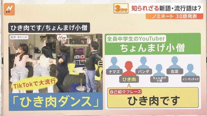 TikTokでも大流行している全員中学生のYouTuber「ちょんまげ小僧」というグループがあり、メンバー「ナマズ」「パンダ」「右足」「イソ・ギンチャク」「ちょんまげ小僧」、もう一人が「ひき肉」で、その自己紹介の独特のリズムの「ひき肉です」というフレーズが流行っています。