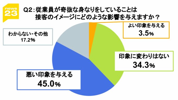 ▽従業員が奇抜な身なりをしていることが接客イメージにどのような印象を与えるか聞いたところ、【悪い印象を与える】が4割を超え、最も多くなりました。次いで【印象に変わりはない】が3割あまりで続きました。
