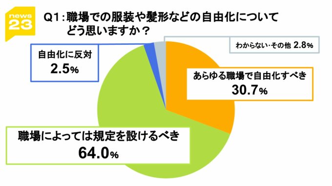 ▽職場などでの服装自由化について、約6割の人たちが【職場によっては規定を設けるべき】と答え、最も多くなりました。次いで約3割の人たちが【あらゆる職場で自由化すべき】と答えました。